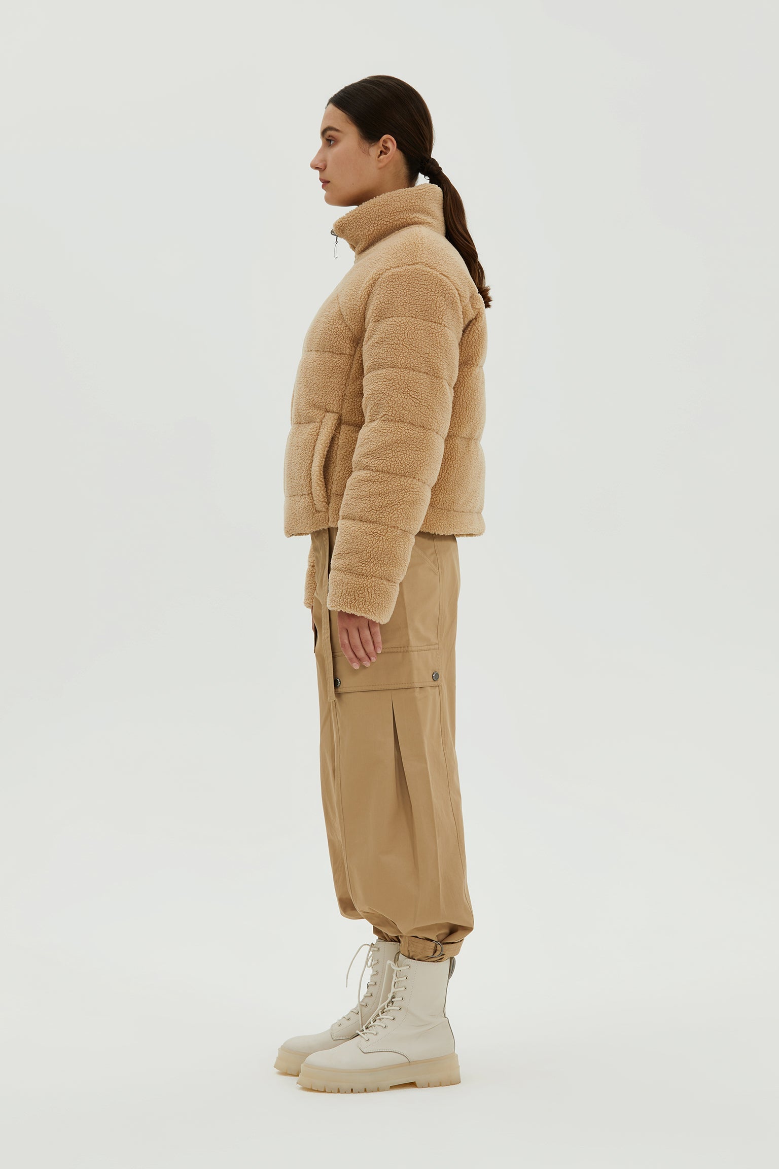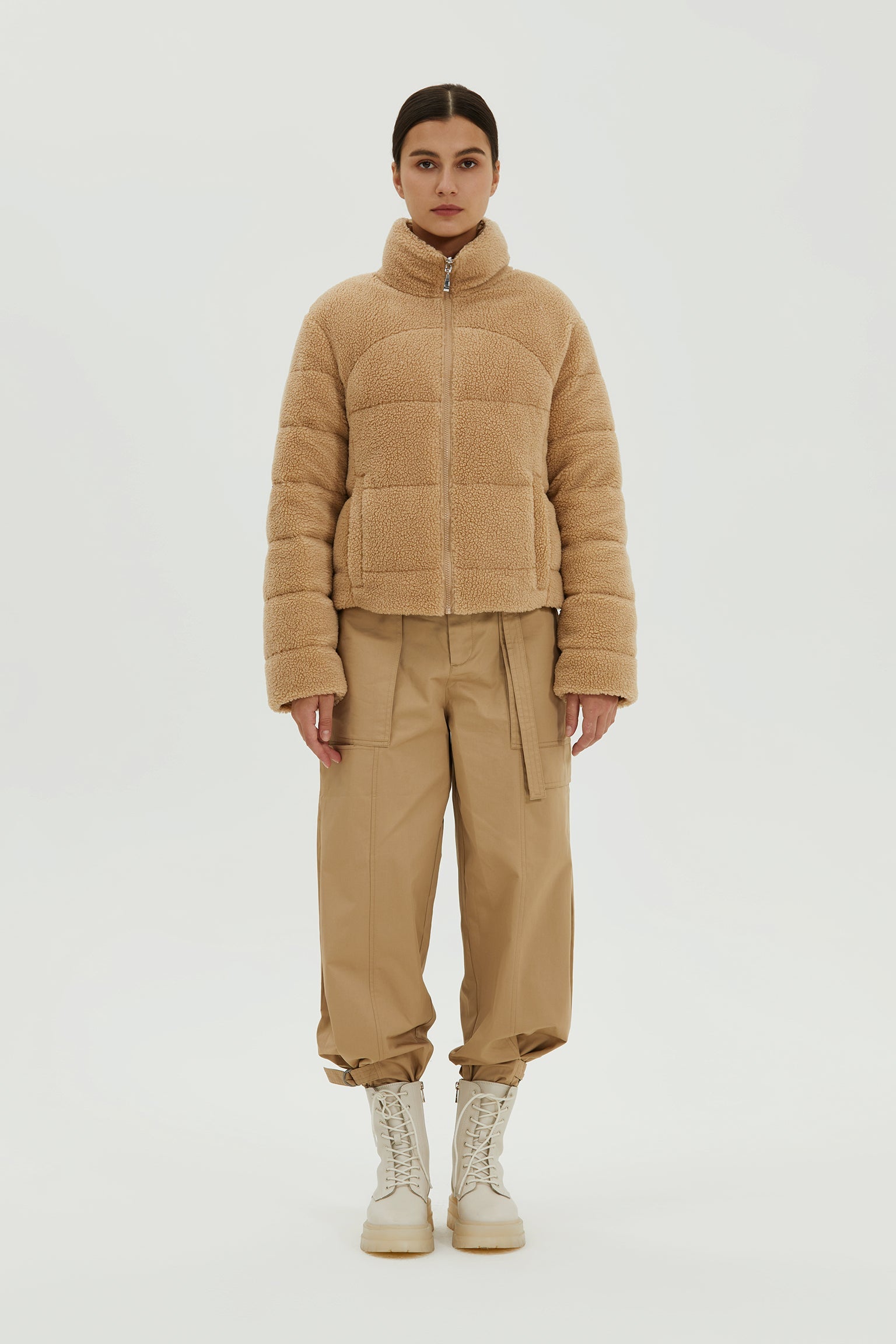 Junia is a plush teddy down puffer jacket for women with a stand collar. An on trend oversize fit, insulated pockets, and cuffs provide added warmth in deep winter.It's made with ultra shaggy fleece that’s extra cozy, warm.